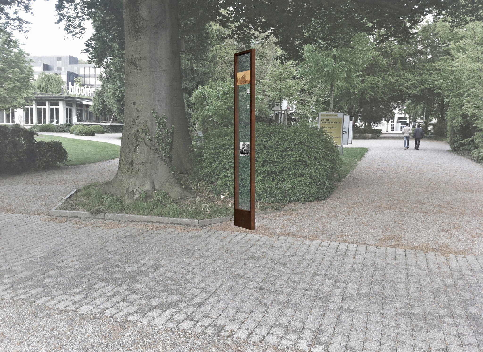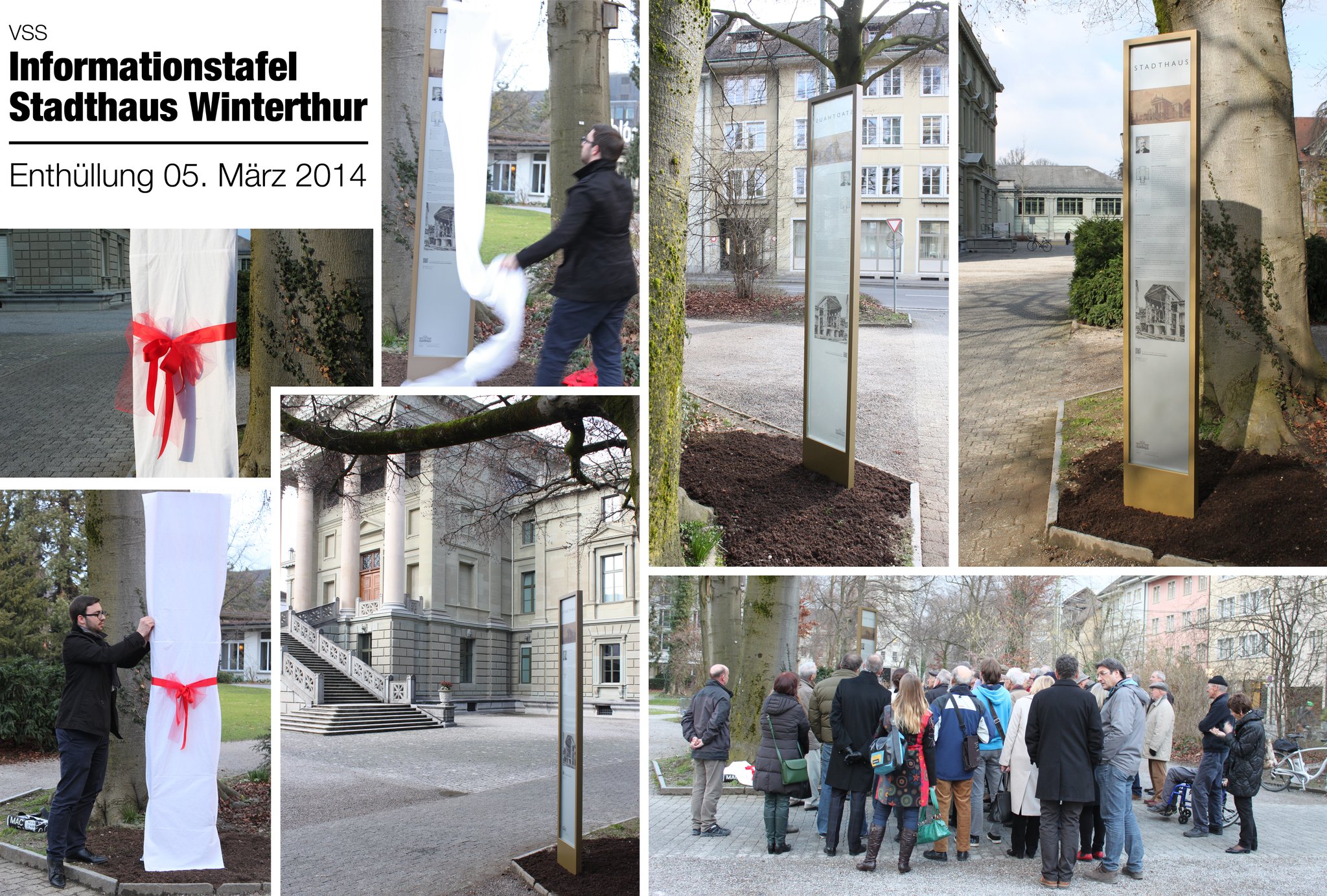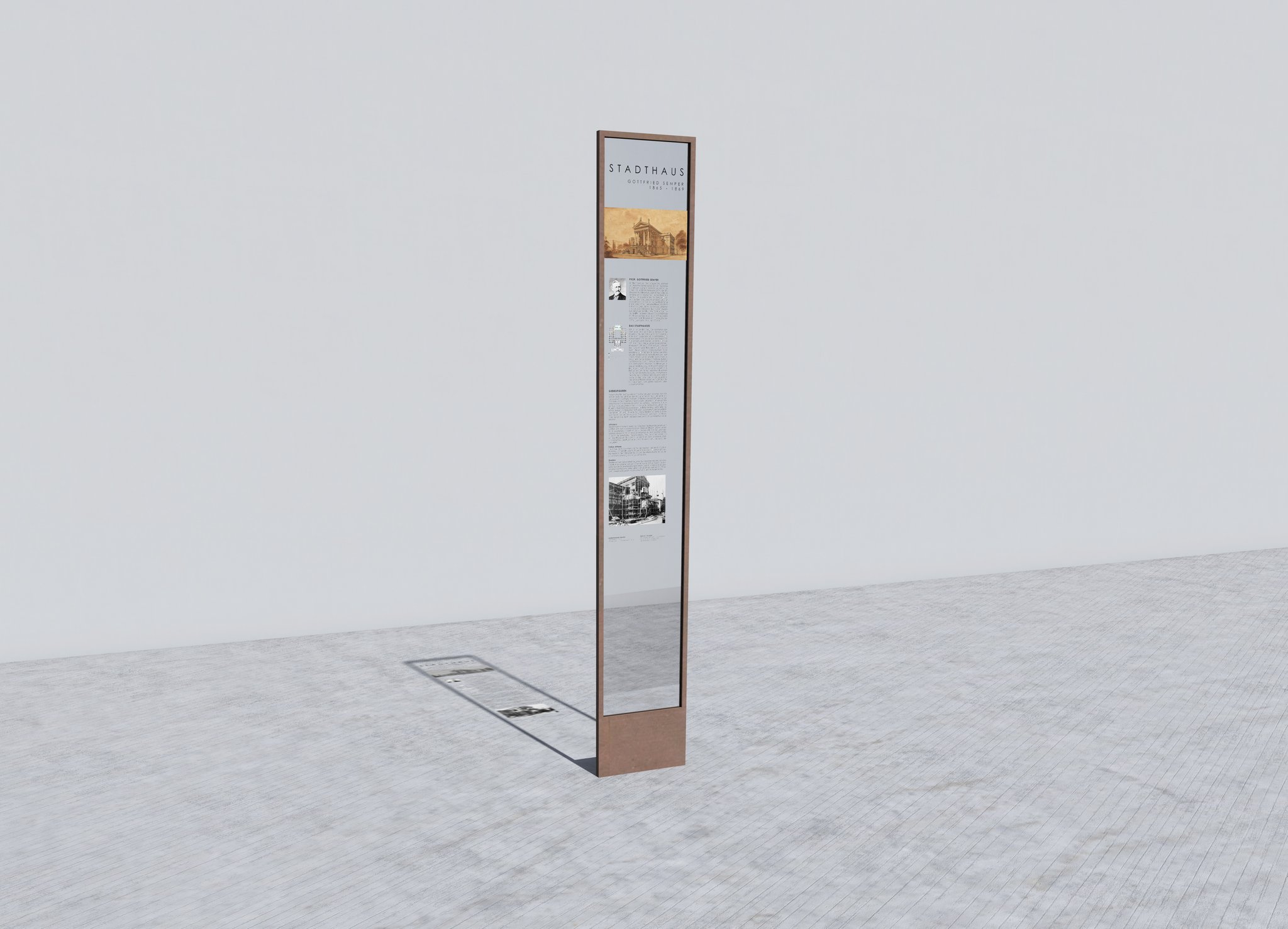 Südöstlich der grossen Freitreppe des Stadthauses wurde eine Informationstafel errichtet. Der schlichte Entwurf mit einer umlaufenden Rahmenkonstruktion und einer eingefassten Glasplatte fügt sich mit seiner metallenen Lackierung dezent in die Umgebung ein. Das folierte Layout mit Text, Fotografien und Plänen ist klar strukturiert und somit einfach lesbar.