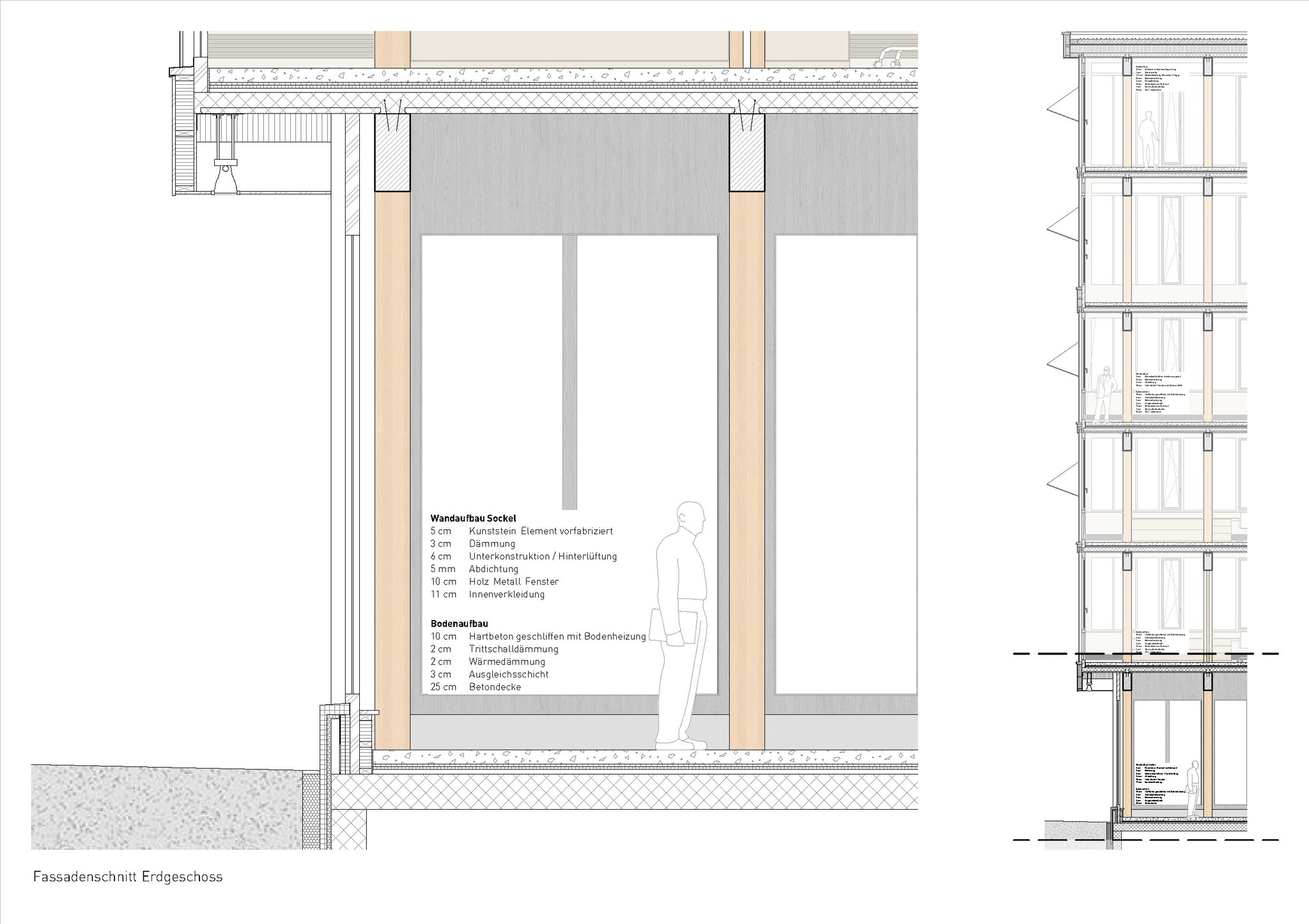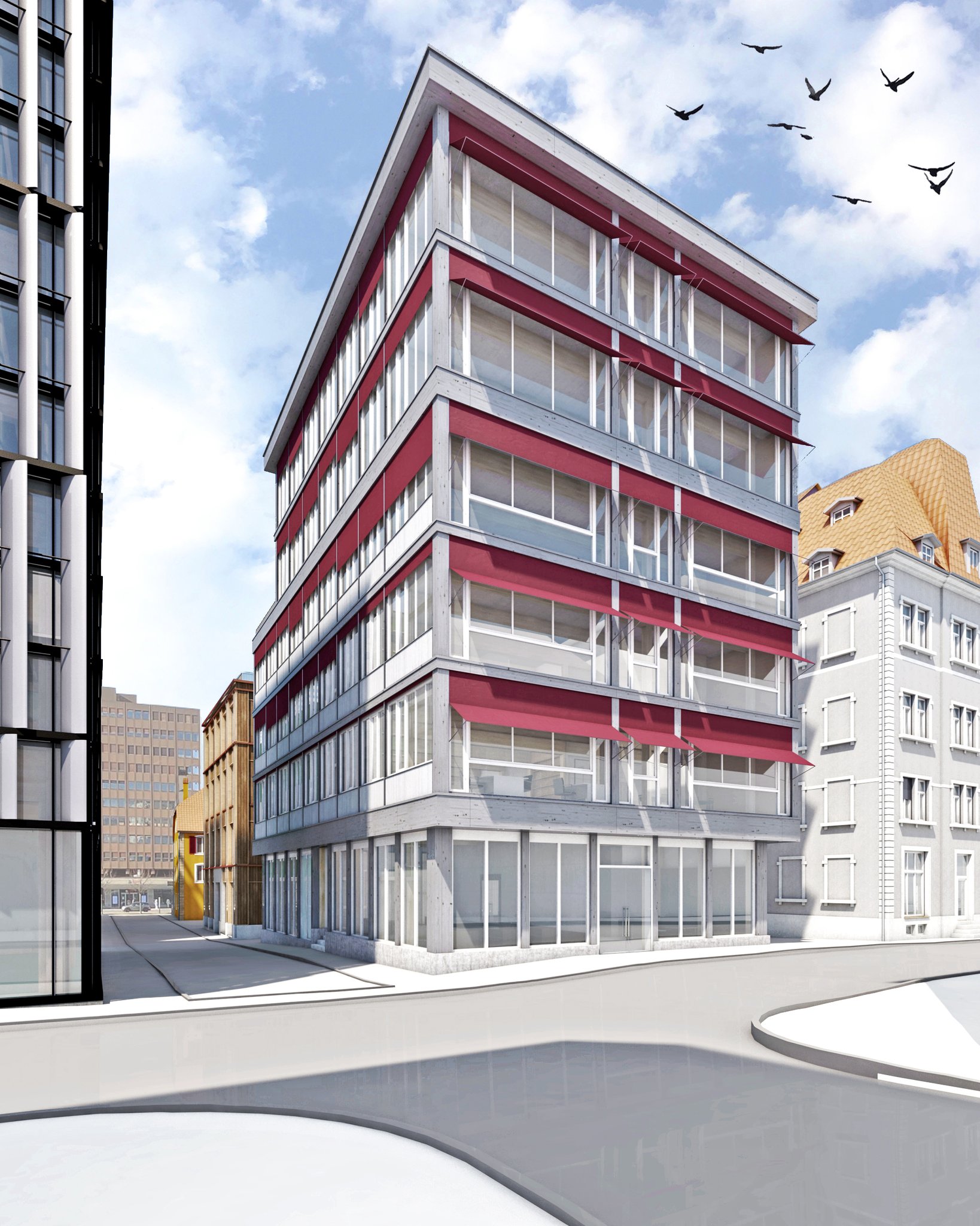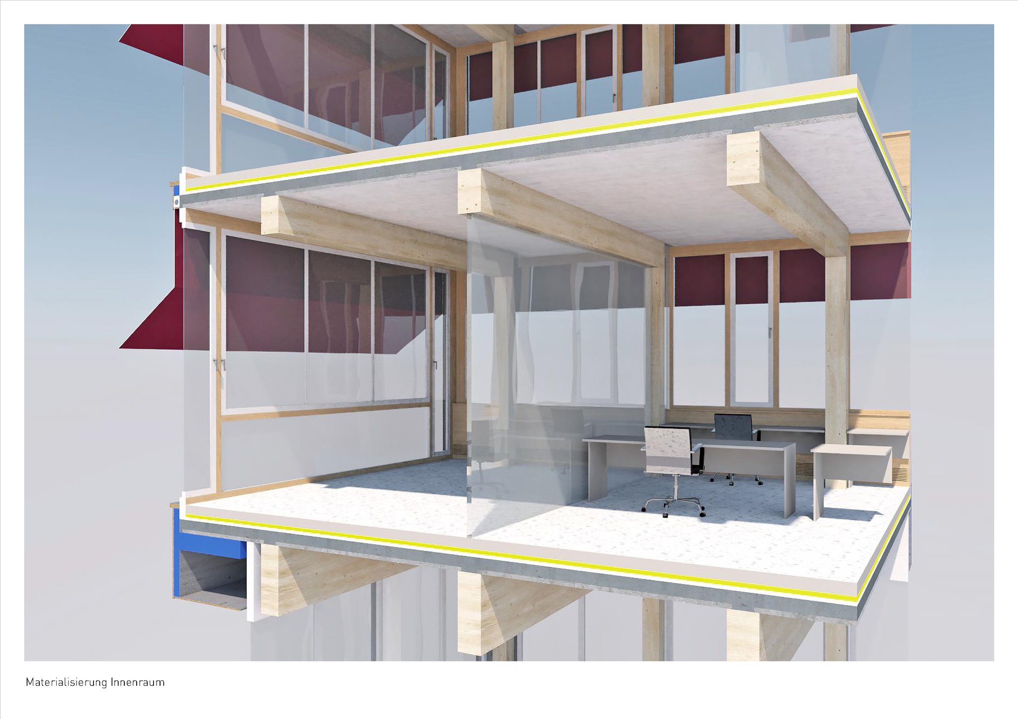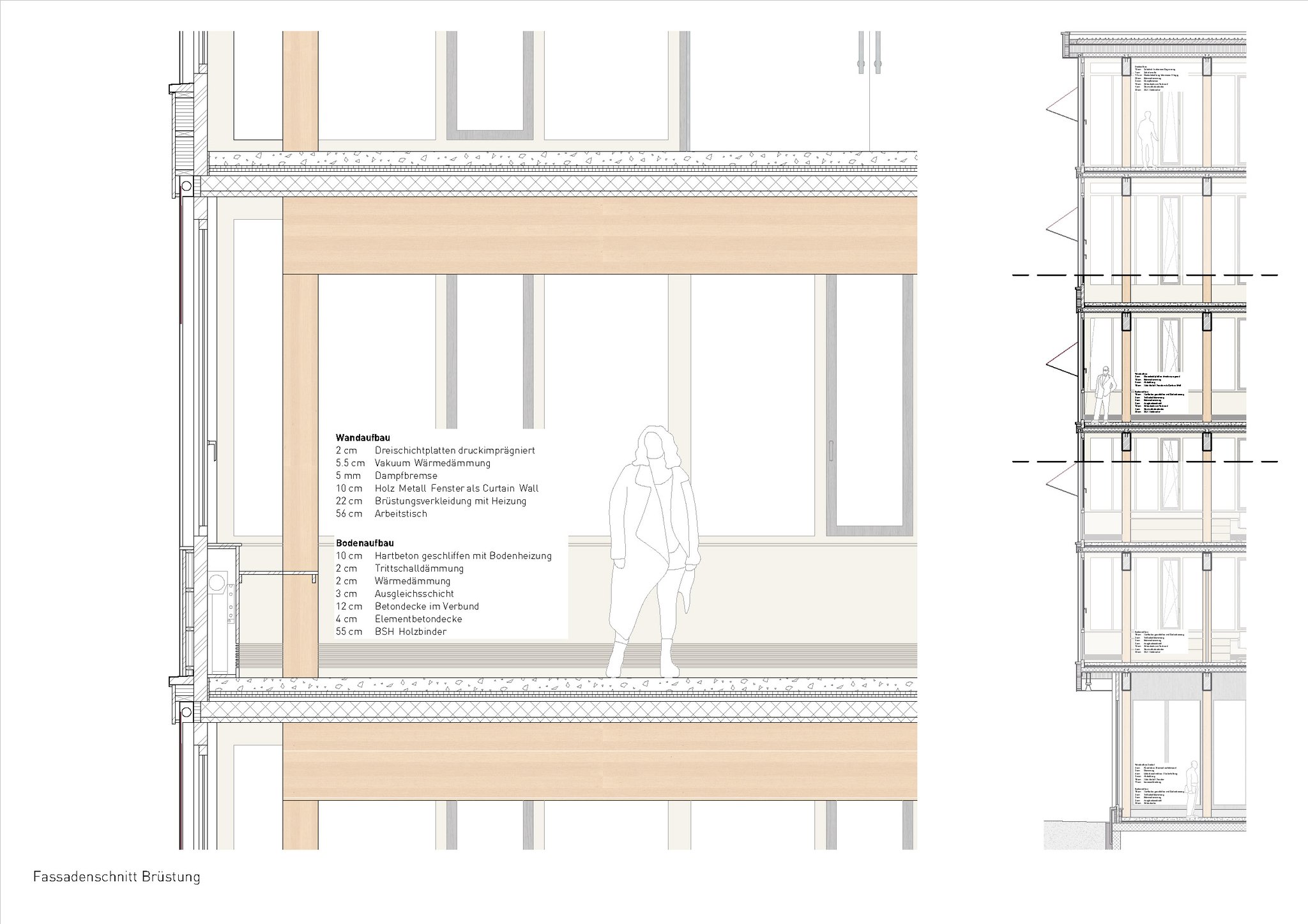 In den Obergeschossen löst sich die Fassade vollständig von der Tragstruktur und folgt dem Prinzip einer Curtain-Wall. In den ersten drei Obergeschossen, wo es eine Fensterbrüstung gibt, dienen diese als Arbeitsplätze direkt am Fenster. Die Innenwände in den Obergeschossen sind flexibel auf die jeweiligen Nutzungen anpassbar. Das vierte und fünfte Obergeschoss sind zwei Achsen zurückversetzt, um einerseits die städtebauliche Idee der Höhenstaffelung aufnehmen zu können und andererseits einen Aussenraum zu generieren. Das Gestaltungsprinzip des Absatzes findet als durchgängiges Thema Anwendung.