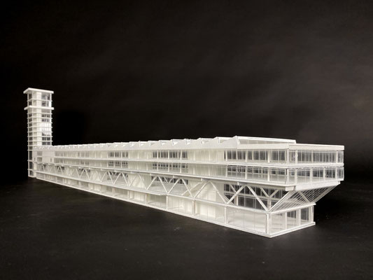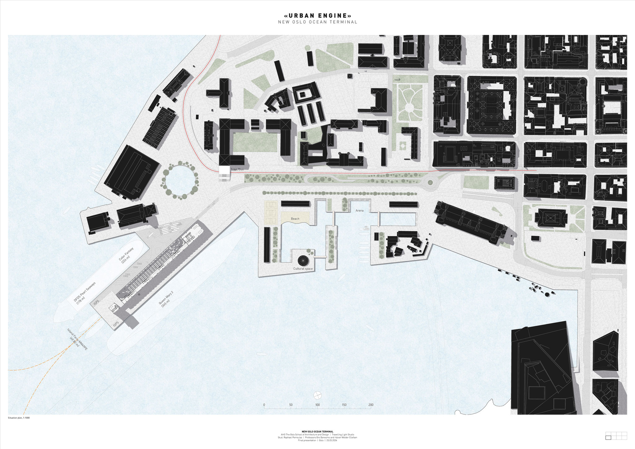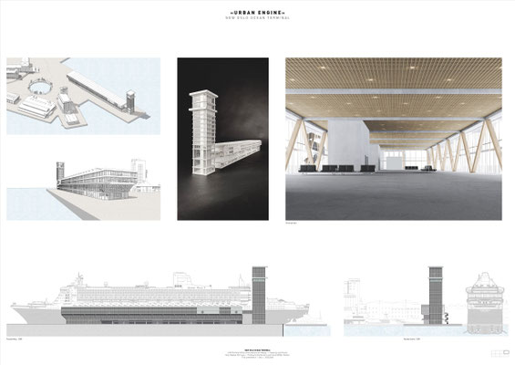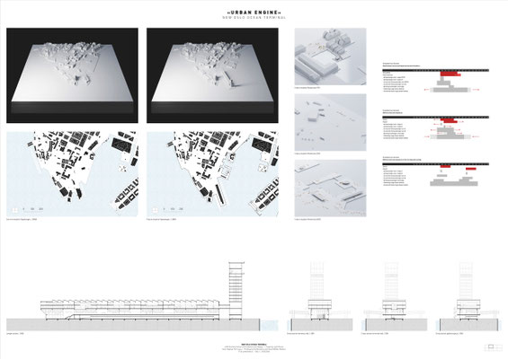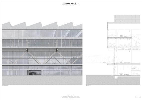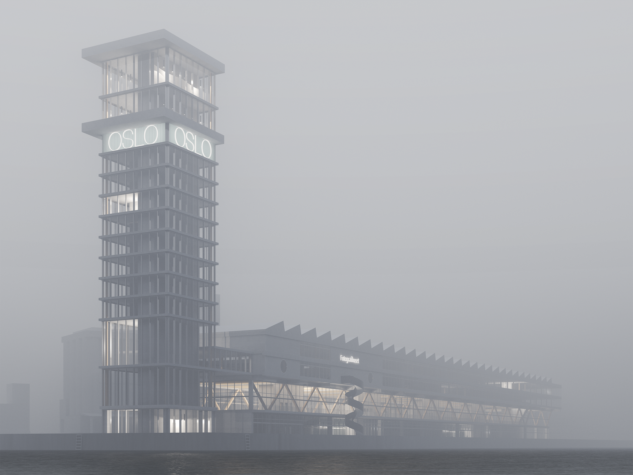 Die reiche Geschichte als zentral gelegener Hafen für Oslo soll seine Fortsetzung in einem Terminal finden, welches sich als prägnantes, öffentliches Gebäude versteht. Die Materialisierung und Gebäudetypologie transformiert den Gedanken eines Hafenschuppens in eine zeitgenössische Form. Ein durchgehendes Raster der Tragstruktur lässt verschiedene, gross- und kleinformatige Nutzungen zu.