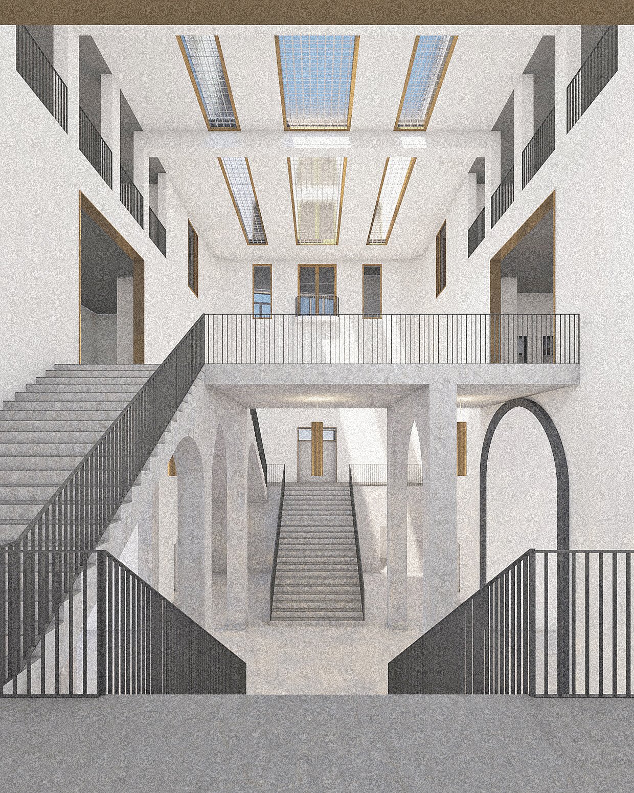 Der Kopfbau reagiert auf die Piazza Giovanni Leone und bildet mit seiner volumetrischen Ausformulierung eines Hochpunktes den Abschluss des Masterplan-Gebiets. Die trapezförmige Geometrie des Bauplatzes wird durch eine mittige Erschliessungsachse durchbrochen, an welcher die innere Organisation ihre Ausrichtung findet. Als zusätzliche Durchwegung wird eine Querachse eingeführt. In Anlehnung an das Referenzobjekt (Palazzo Serra di Cassano, 1719) führt die Hauptachse durch eine vielseitige Raumabfolge mit einem Oktogon-Hof sowie zwei repräsentativen Treppenhallen. Diese brückenartigen Treppen führen als Haupterschliessung auf die «Verteilerebene» im Piano Nobile, von wo alle Wohnungen und Nutzungen mit vier Wendeltreppen erschlossen werden. Die anspruchsvolle Gebäudeform lässt vielfältige Wohnungstypologien zu. Weiteren Bezug zum Referenzobjekt nimmt die Höhenstaffelung im Hofbereich. Um eine Einfügung im städtischen Kontext zu erwirken, weisen die Fassaden mit ihre steinernen Fensterleibungen, Friesen und Balkonen eine klassische Gestaltung auf.